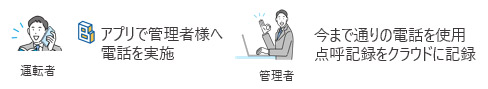 専用アプリで管理者へ電話すると録音が開始されます。管理者はクラウド画面へ点呼記録を入力します。
