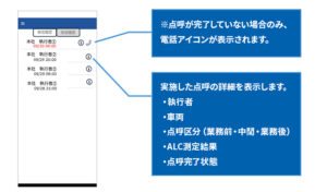 点呼履歴画面では呼び出しを行った管理者や点呼結果を表示し、完了していない場合は呼び出し用の電話アイコンが表示されます。